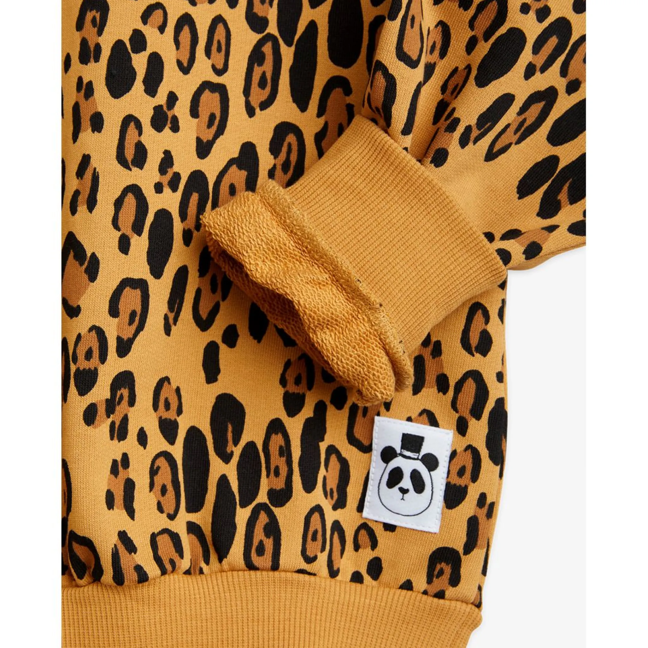 Beige sweatshirt featuring an all over Leopard print, made from 100% GOTS certified organic cotton. The sweatshirt is designed with a Mini Rodini Panda label, raglan sleeves along with ribbing at the neck, sleeve ends and bottom hem.