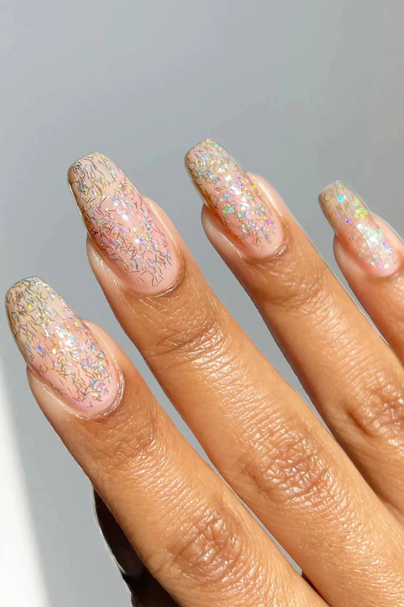 Twinkle Tweed is a tweed-textured glitter topper with multi-colored holographic short-slice pieces.