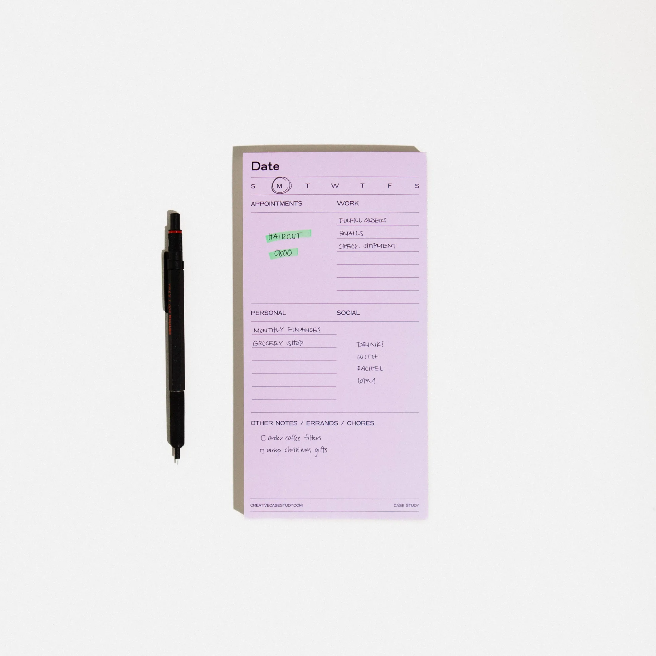 It’s chunky.It’s functional.It’s an all-in-one way to structure your day.Each page breaks the day into four sections: work, appointments, social, and personal, with extra space for notes. Tear off the sheet at the end of the day and start fresh tomorrow. 100 pages – 50 pink sheets followed by 50 butter yellow.+ 4 x 8 inches+ 100 tear away sheets: 50 pink, 50 butter yellow+ Designed and printed in Santa Cruz, CA+ 70lb smooth uncoated paper suitable for ballpoint pens + Thick backing stock in a deep burgundy color