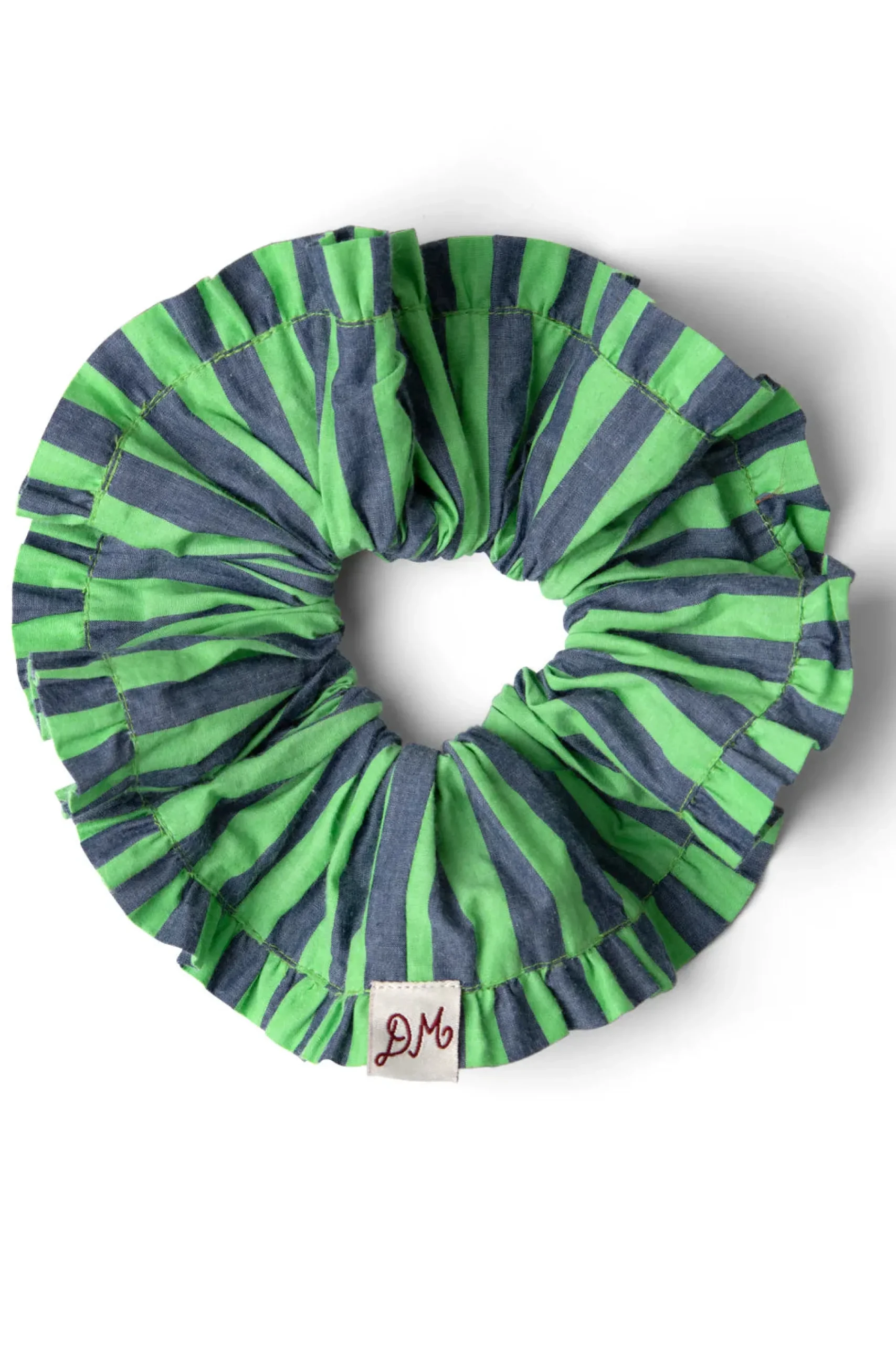 Oversized piping tie scrunchie in navy and lime with red DM embroidery. Made from 100% organic cotton, this scrunchie will elevate any hairstyle.
