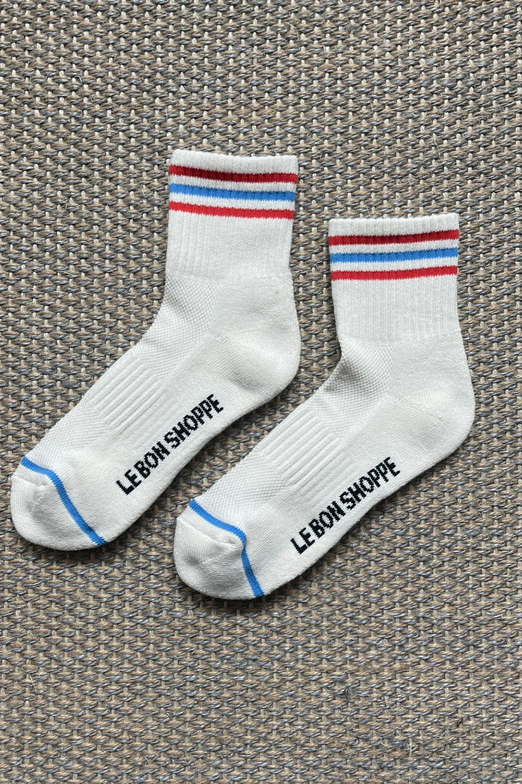 A little sister sock to the much loved Le Bon Shoppe Boyfriend socks. A true crew with all the same vintage inspired details – super soft ribbed cotton in leche with contrast stripes. We love pairing these guys with our cropped pants and sneakers for a shorter look. Available in additional fun colors too.