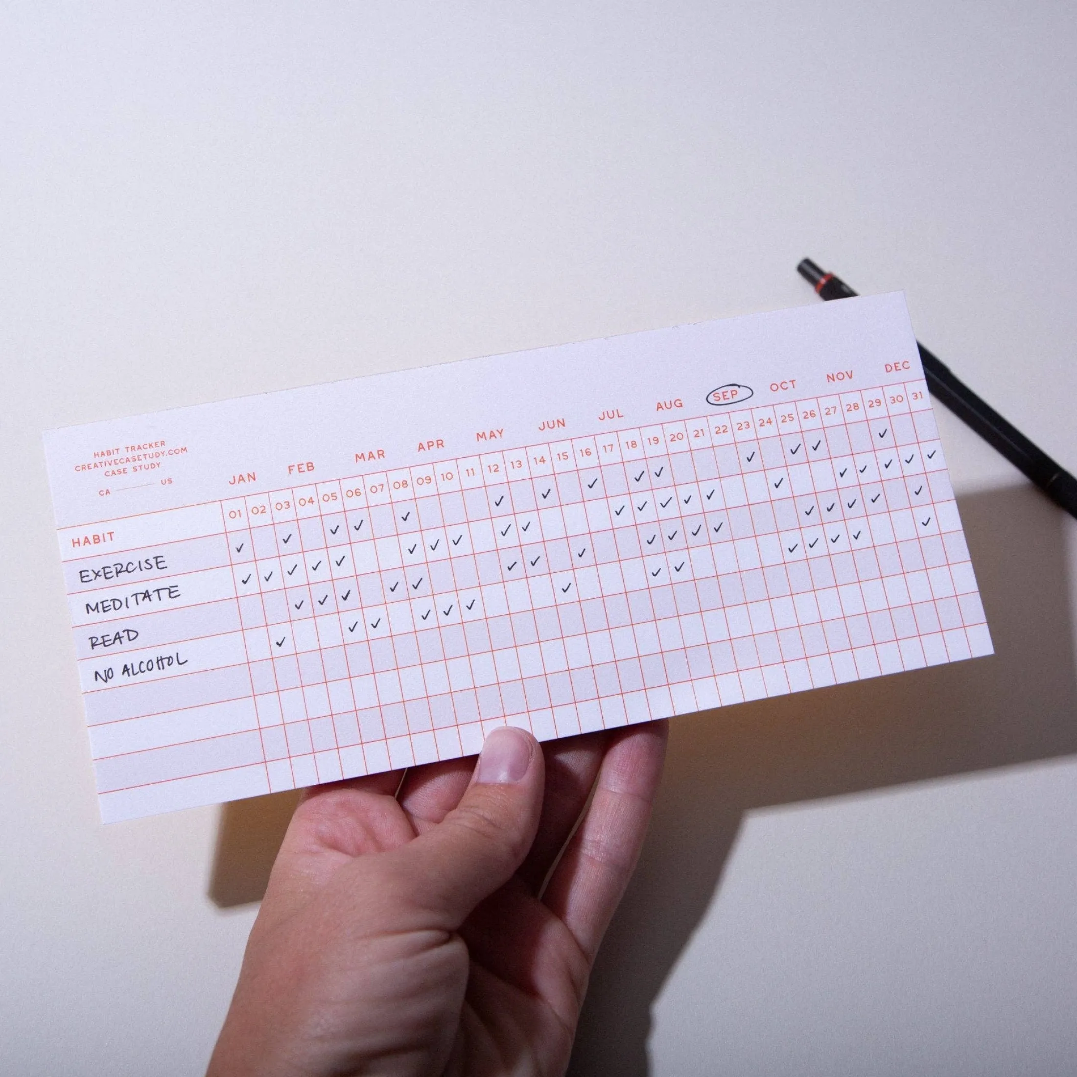 An A+ companion for your self-improvement journey.Each page is dedicated to a single month, providing ample space for you to record and monitor your daily habits. Whether you’re aiming to exercise more, eat healthier, read regularly, or cultivate mindfulness, this notepad helps you keep tabs on your goals.Keep your sheets as you go to see how you’ve progressed over the course of a year!DETAILS+ 3.5×8 inches+ The pad contains 25 sheets, which means you’ll be able to track your habits for 2 years (1 sheet per month).+ Designed and printed in Santa Cruz, CAMATERIALS + CARE+ 80lb smooth uncoated paper perfect for both pens and pencils+ Thick backing stock in Citrine color