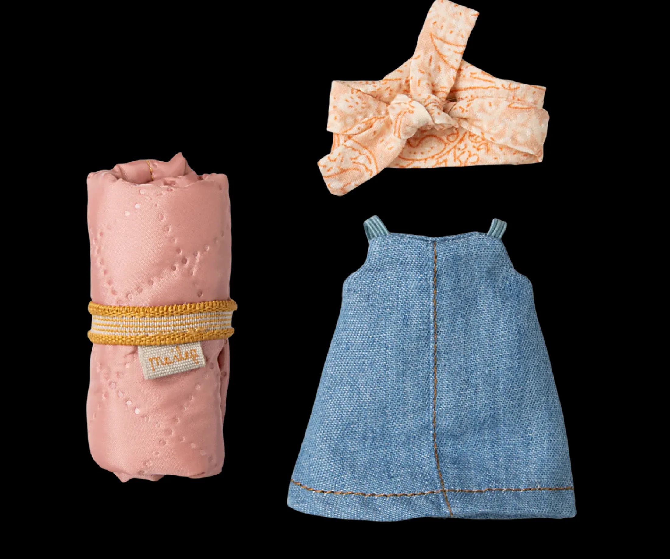 This mouse is well-prepared for a hiking trip in the wild nature. She is dressed for days of walking and brings her sleeping bag for nights under the stars. She has magnets in her hands. Add more accessories from the hiker collection for more play.