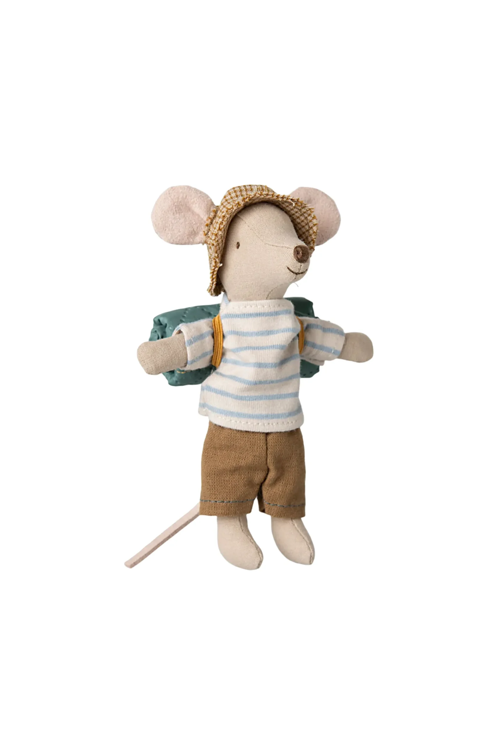 This mouse is well-prepared for a hiking trip in the wild nature. He is dressed for days of walking and brings his sleeping bag for nights under the stars. He has magnets in his hands. Add more accessories from the hiker collection for more play.