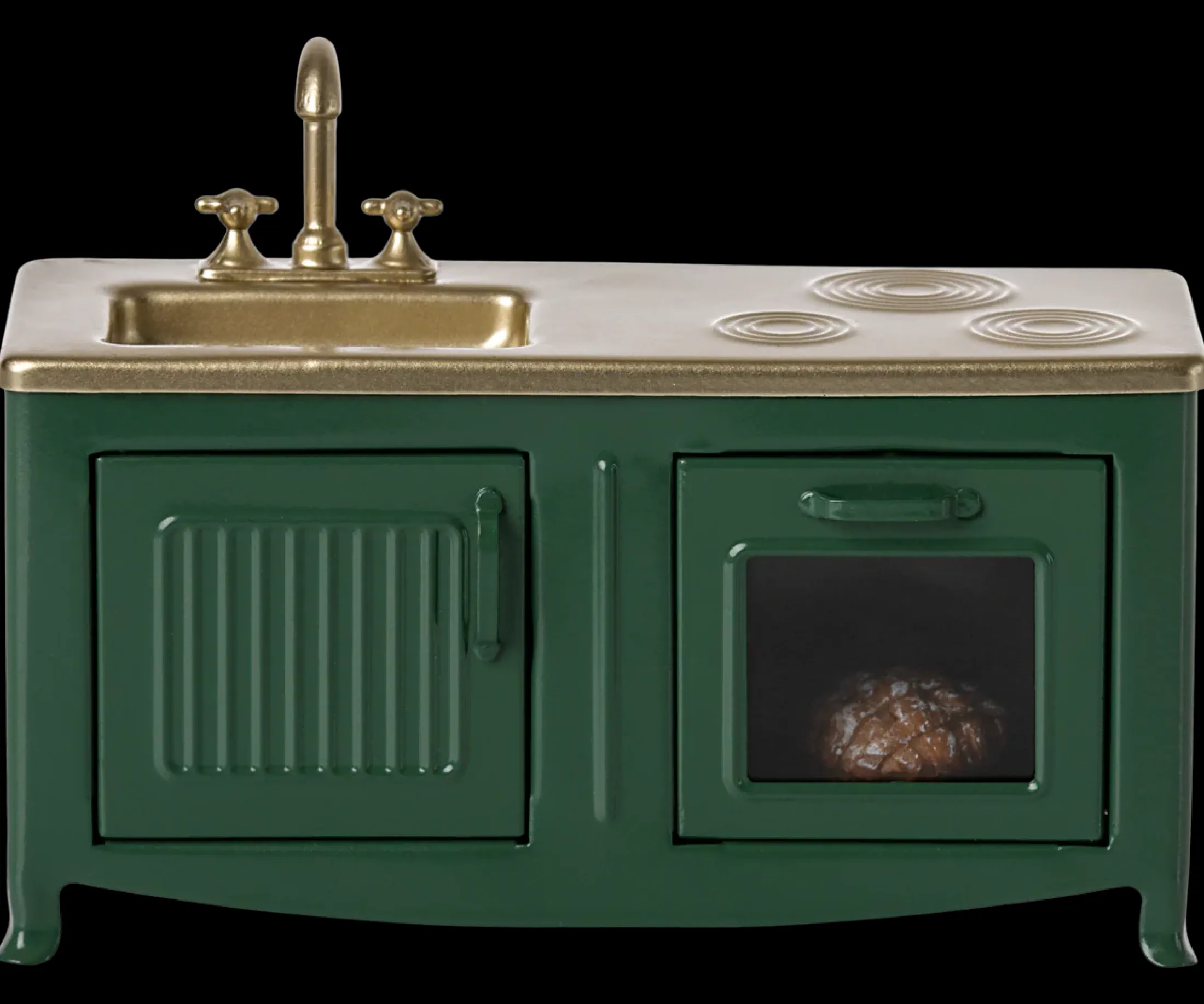The kitchen is the heart of every home. This kitchen’s has many playful details such as the pleasant hue and subtle details like the cabinets, sink, and oven with freshly-baked pie. It’s the perfect size for the mouse family.