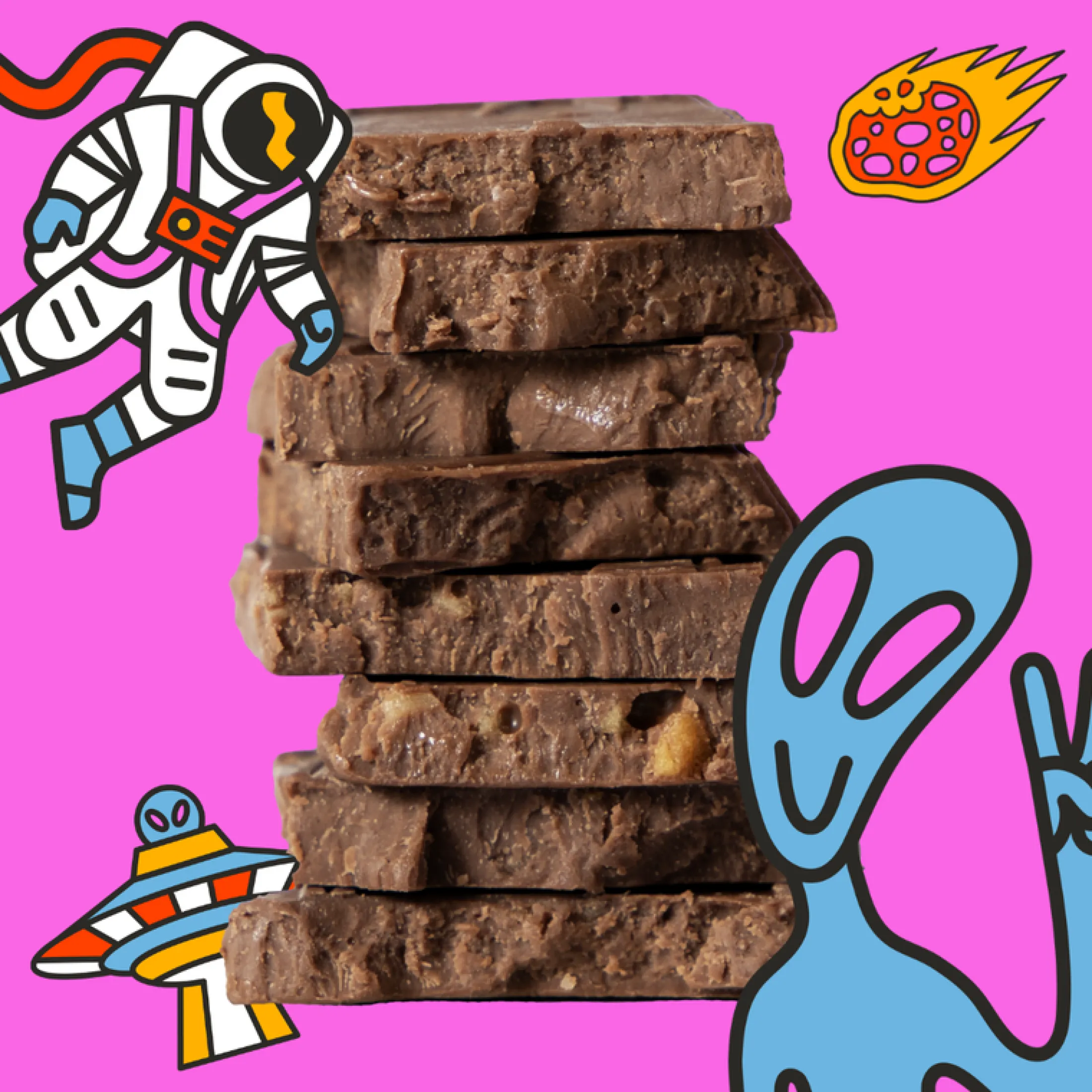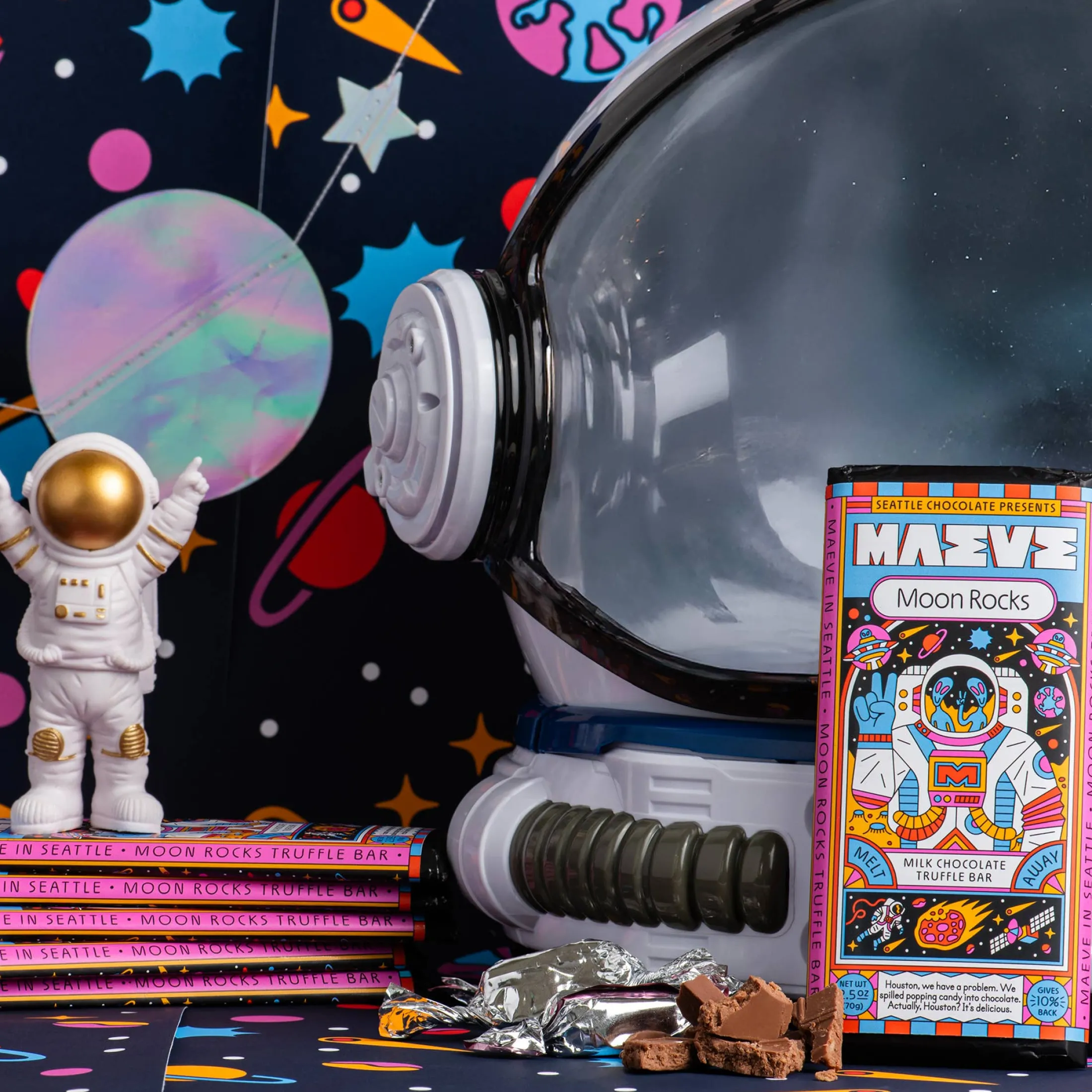 Houston, we have a problem. We spilled popping candy into chocolate. Actually, Houston? It’s delicious. Perfect for all astronauts and space fans!Flavor: Creamy milk chocolate with all natural popping candy.Explore more not-so-simple flavors: Cabin S’mores, Matinee Malt Balls, and Nuts for FruitWhen you pick Maeve, you’re choosing a sustainably sourced, eco-conscious, woman-owned brand — and you’re also choosing FUN.•Woman-owned and led•10% net profits donated to cocoa farmers •Ethically sourced, non-GMO chocolate•Carbon neutral