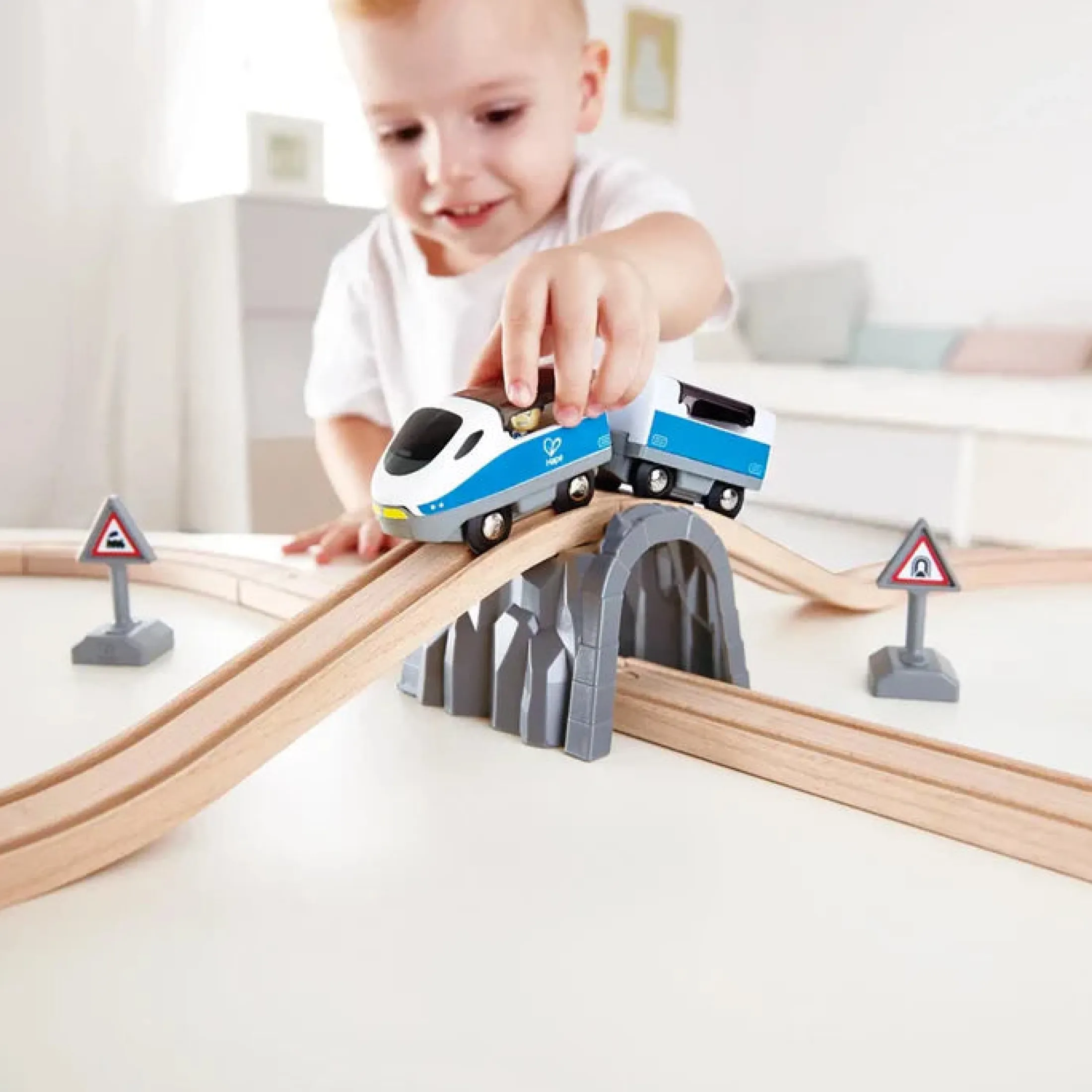 - Includes wooden tracks, an engine with carriage, a tunnel, 2 safety signs, and a rail signal