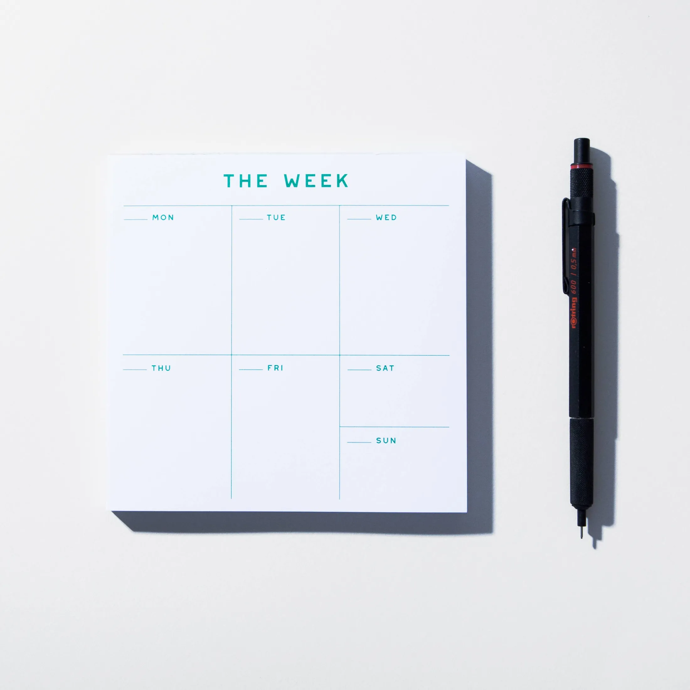 A week-at-a-glance planning system that allows you to visualize and track your weekly goals. Great for a professional or student, this memo block is ideal for writing out reminders, tasks, and notes. You can organize at your own pace with undated pages.Once you’ve completed your week you can easily tear off the sheets to start fresh. Details: * 5×5 inches * 50 tear away sheets * 80lb uncoated paper * Thick backing stock in Marrs Green color * Each pad is packaged individually in recyclable plastic sleeves