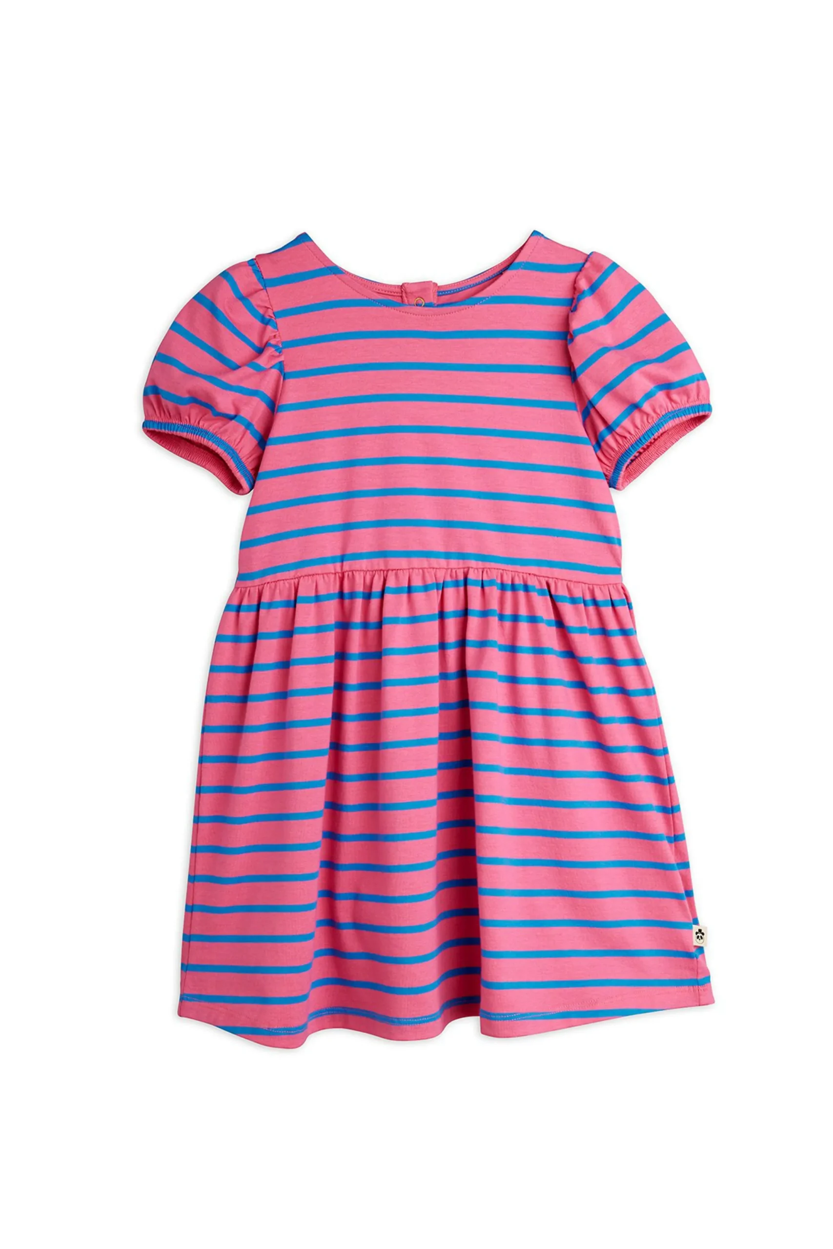 Dress made from 95% organic cotton and 5% elastane. Features short sleeves, with a gathered waist for a playful, flared skirt.