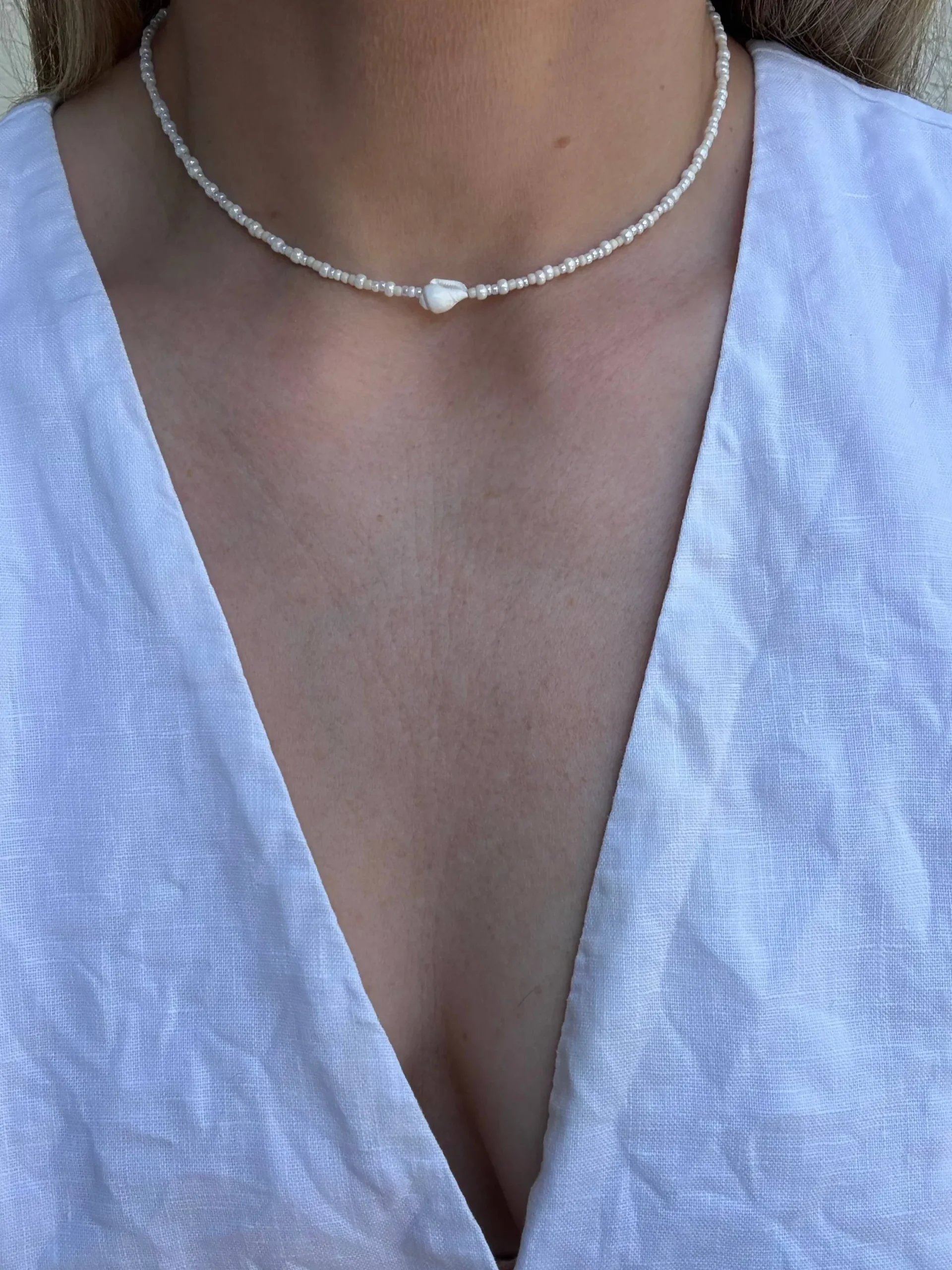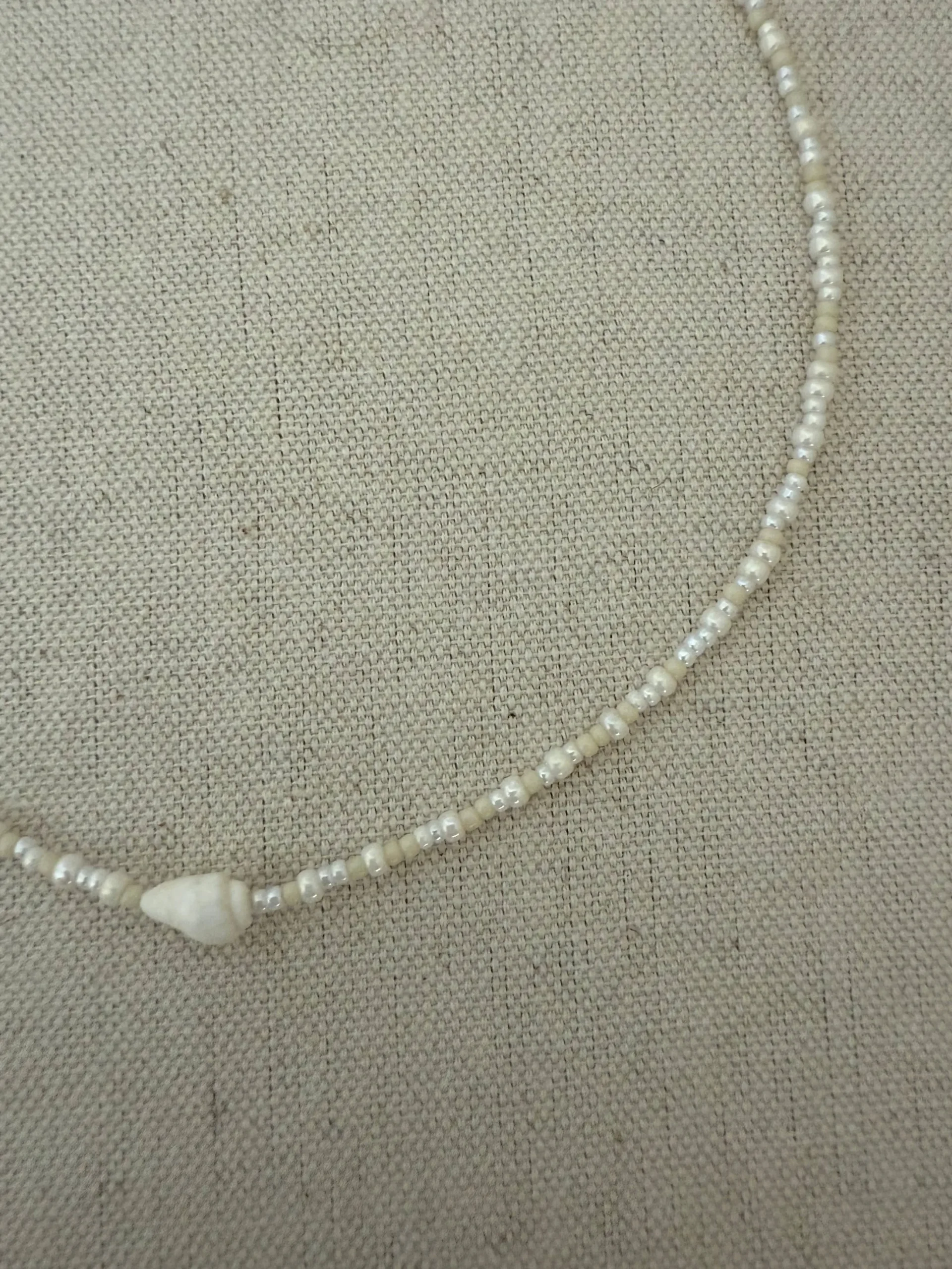 Found treasure energy—with just enough polish to make it fashion. The Castaway necklace is 15.5 inches of iridescent Japanese glass beads and a singular central natural shell that looks like it drifted in on a wave (or maybe just your last vacation).