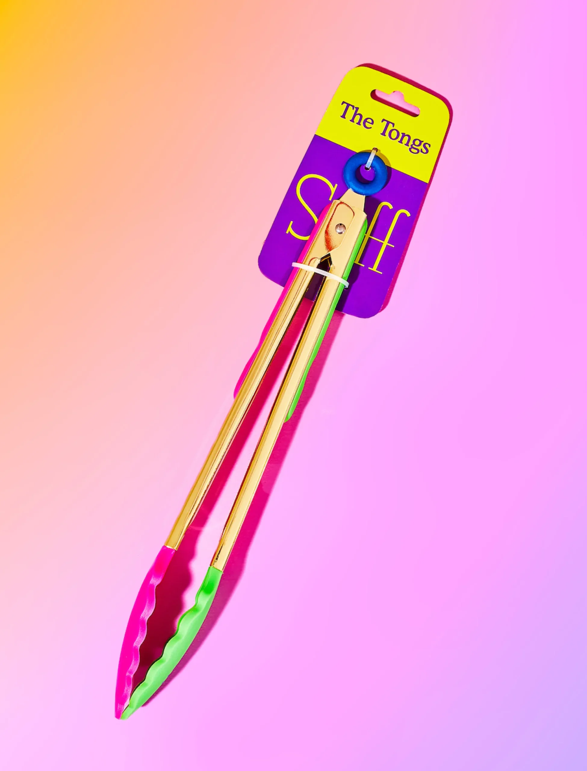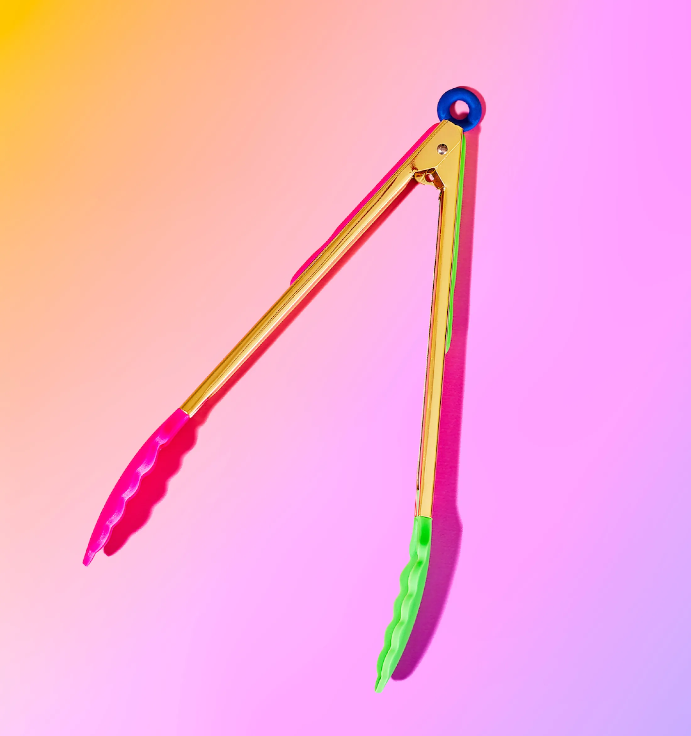 Brighten your kitchen with these sturdy multi-color tongs. One side has pink silicone grips, the other side has green silicone grips. Both sides have a golden stainless steel base and smiley faces eager to lend you a hand. The push-pull ring locking mechanism is the blue cherry on top (or is it bottom)? Compatible with all your cookware, including nonstick.