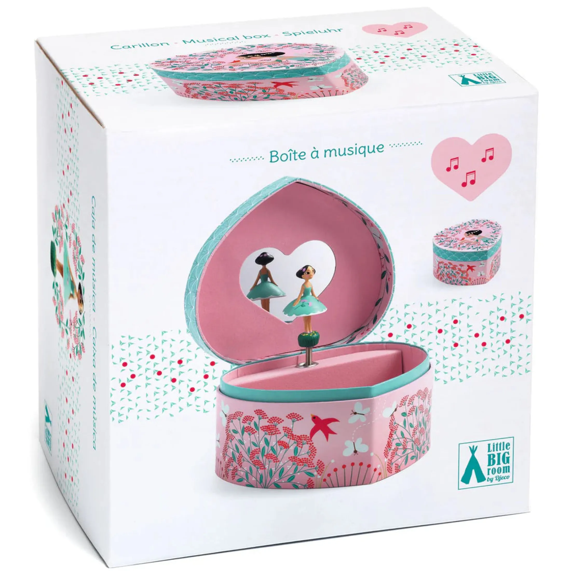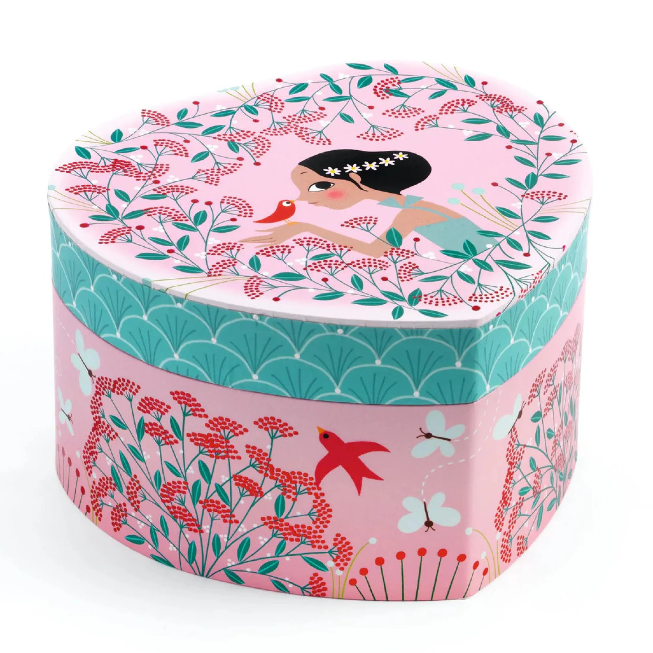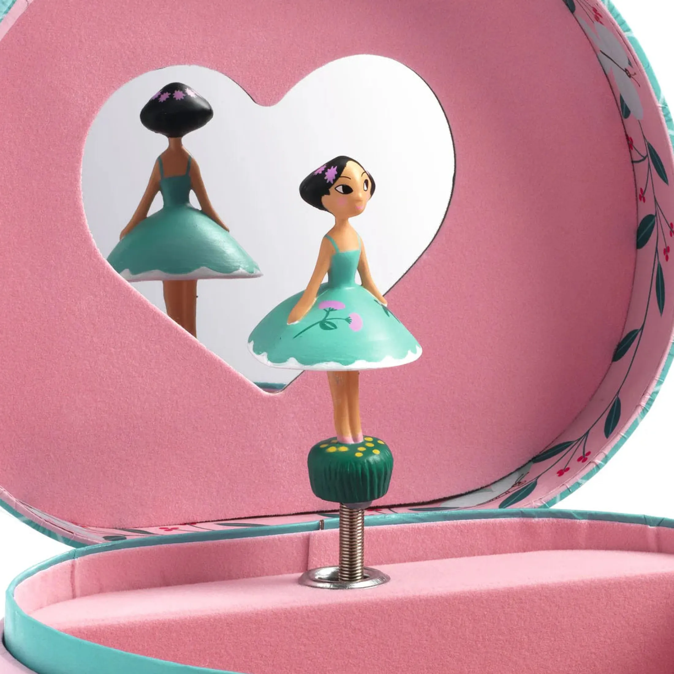 Mélodie du printemps is a pretty, heart-shaped music box for keeping jewelry and secret things in. Turn the handle and open the box for a surprise! A delicately carved dancer turns, reflected in a shaped mirror, to Carl Maria Von Weber’s “Invitation to the Dance”.