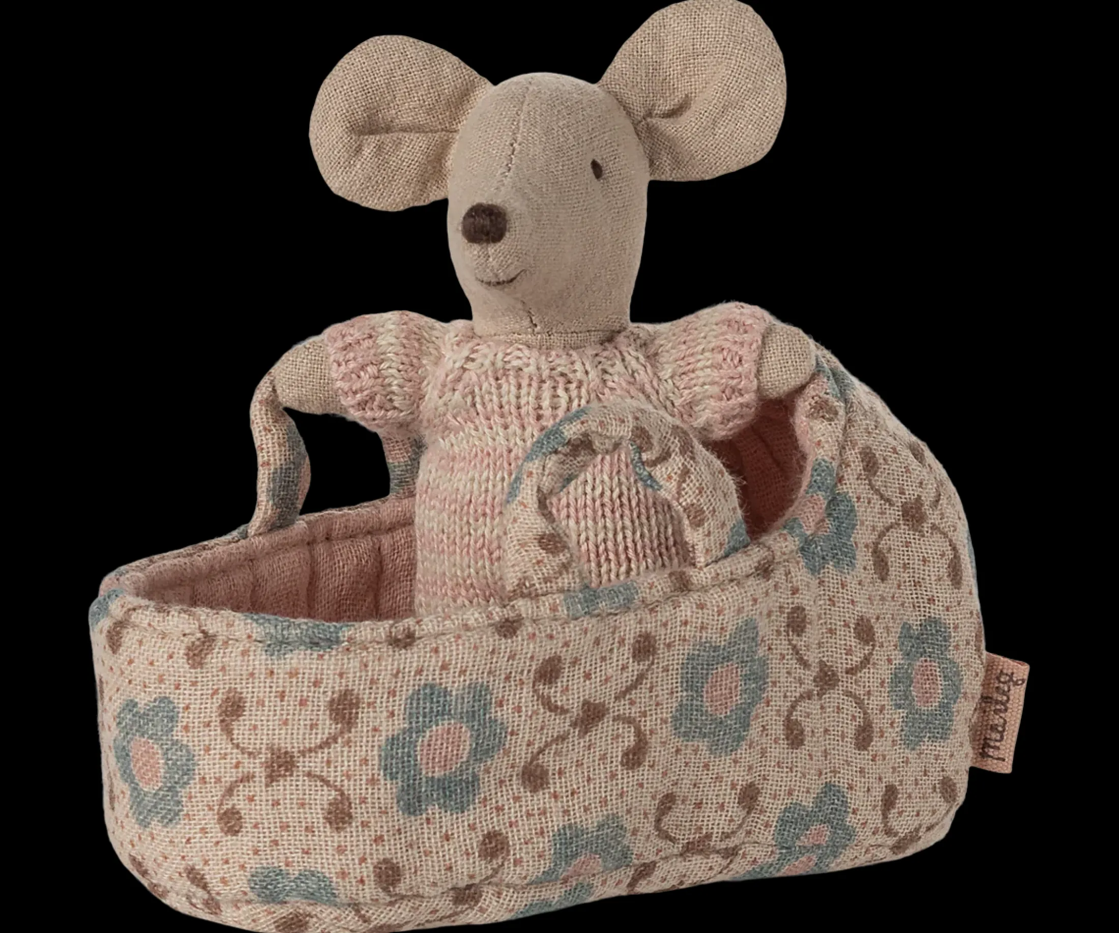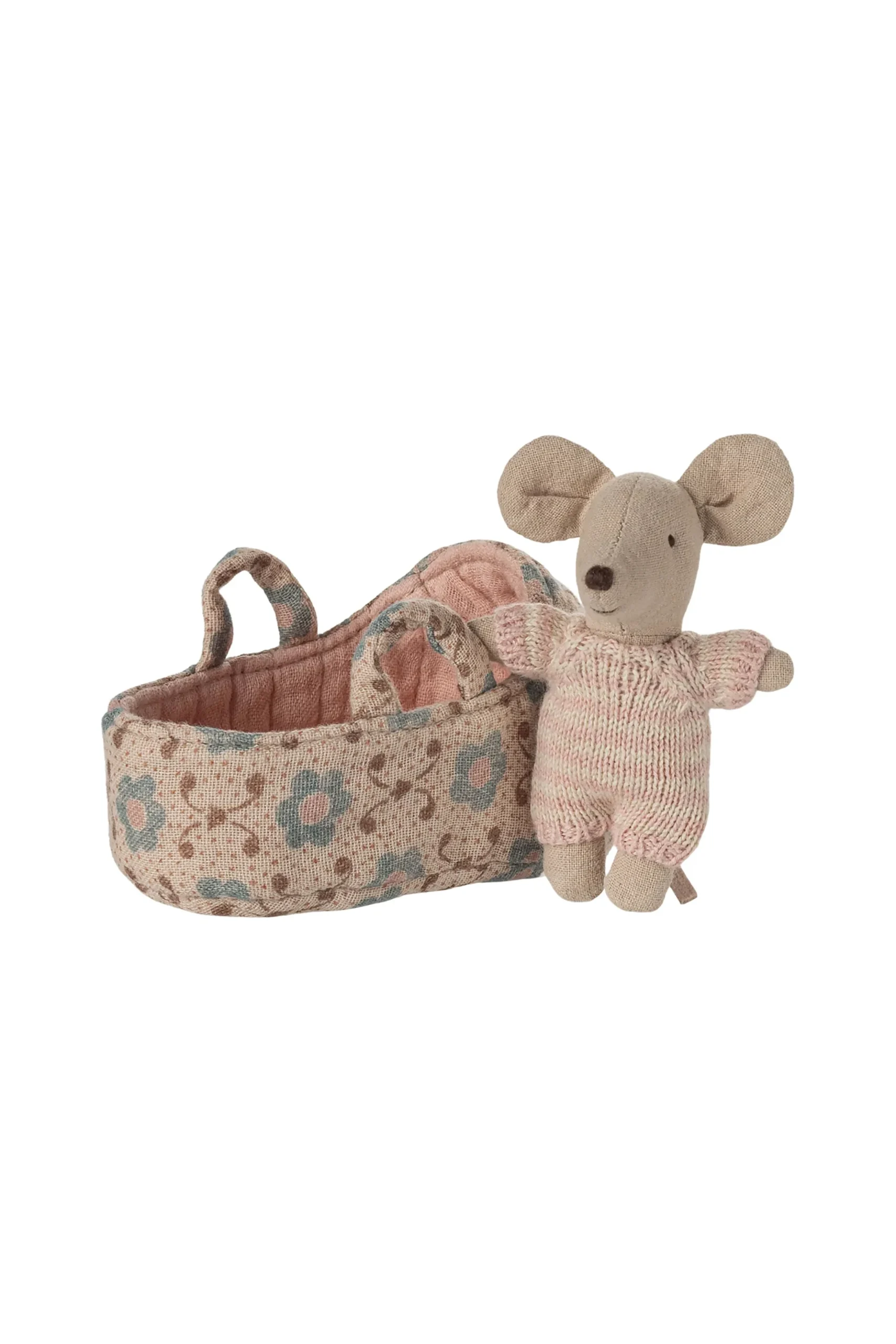 A small baby mouse in a soft and striped knitted suit. It sleeps for hours in its little quilted carry cot.
