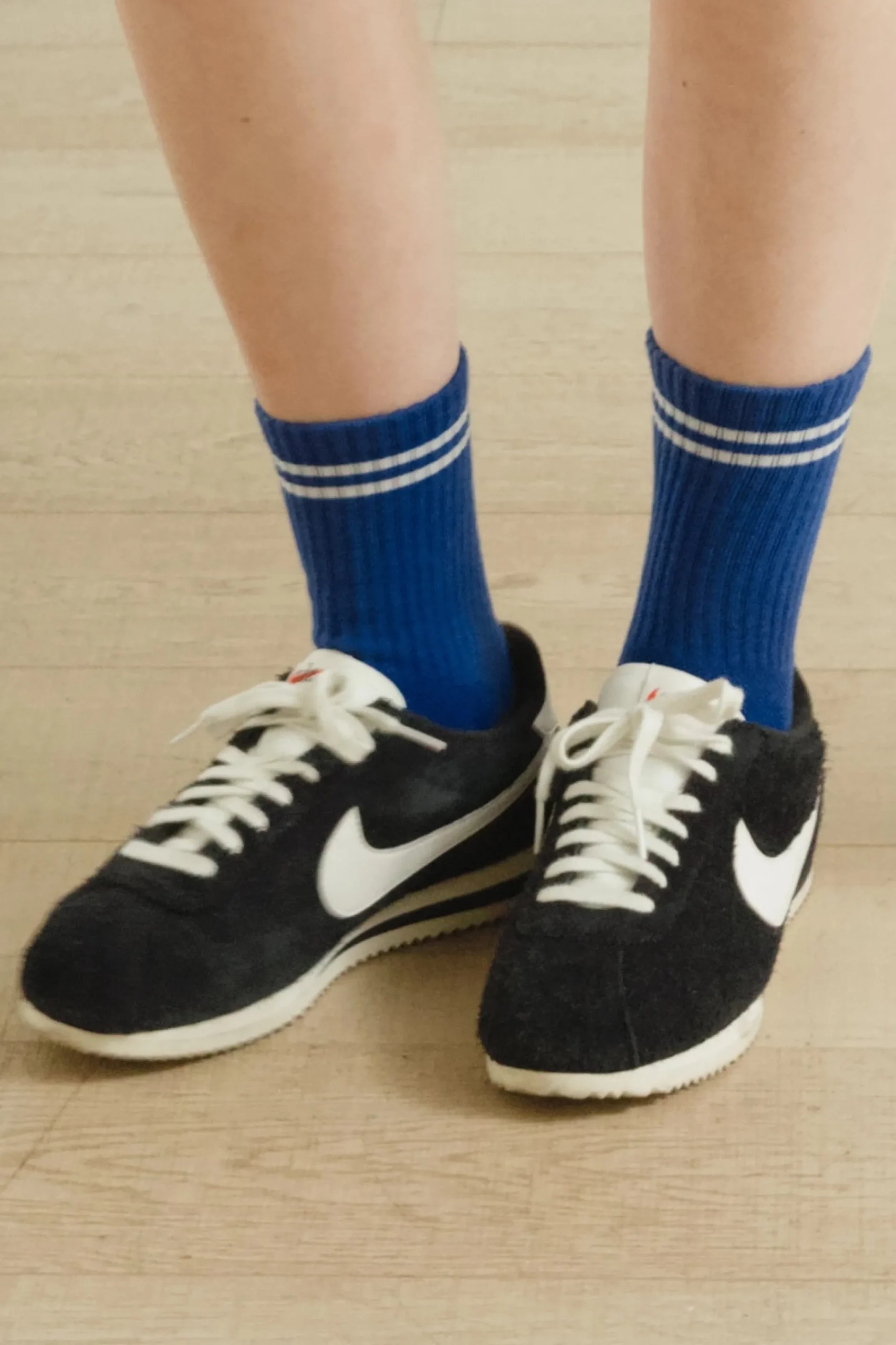 Stay fly all year long in socks that have as much range as your style. These blue calf length vintage-inspired sports socks are our favorite boot, sneaker or slide socks – basically just our favorite socks, period. Cobalt with white stripe accents, these socks will bring a dose of cool to any outfit you pair them with.