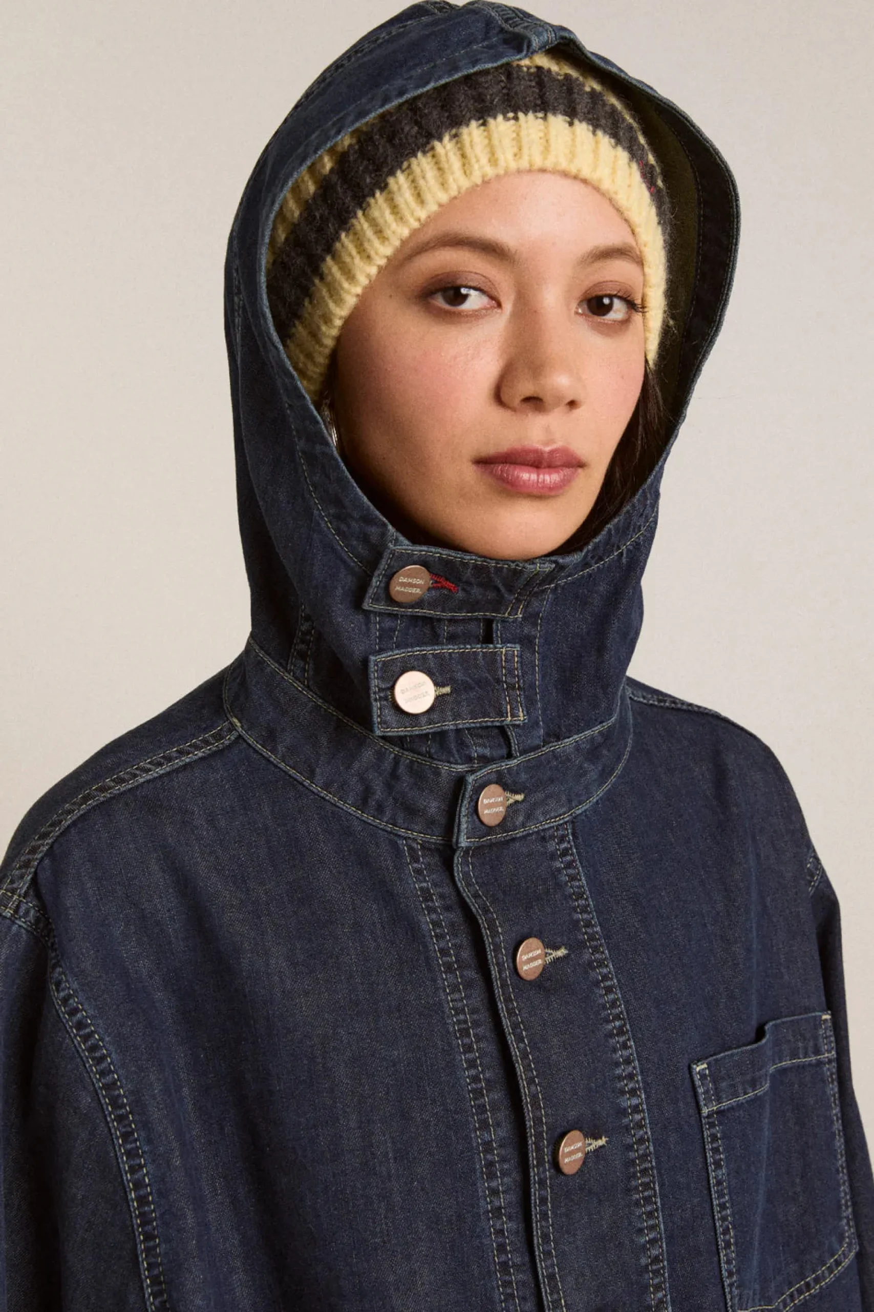 Effortlessly laid back with elevated detailing, this oversized smock-style hoodie is crafted from soft, fluid denim made from 100% organic cotton. Designed with a relaxed silhouette, it features a front shank fastening, contrast stitching, and adjustable cuffs for a custom feel. Functional touches include a front pocket, drawstring hem, and a signature DM branded patch.