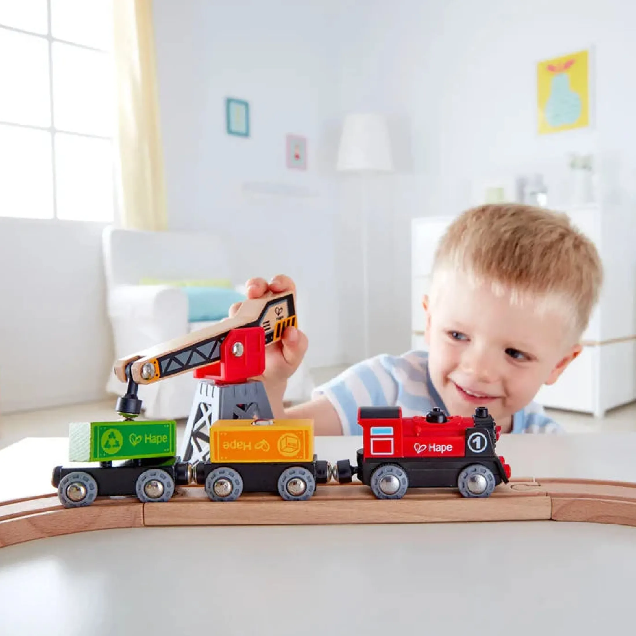 The wooden railway set comes with a realistic crane that picks up and moves cargo on and off the train as it makes its journey around the track. Promotes imagination, creativity role play skills and development. The safety marks teach your little ones key information about railway safety.