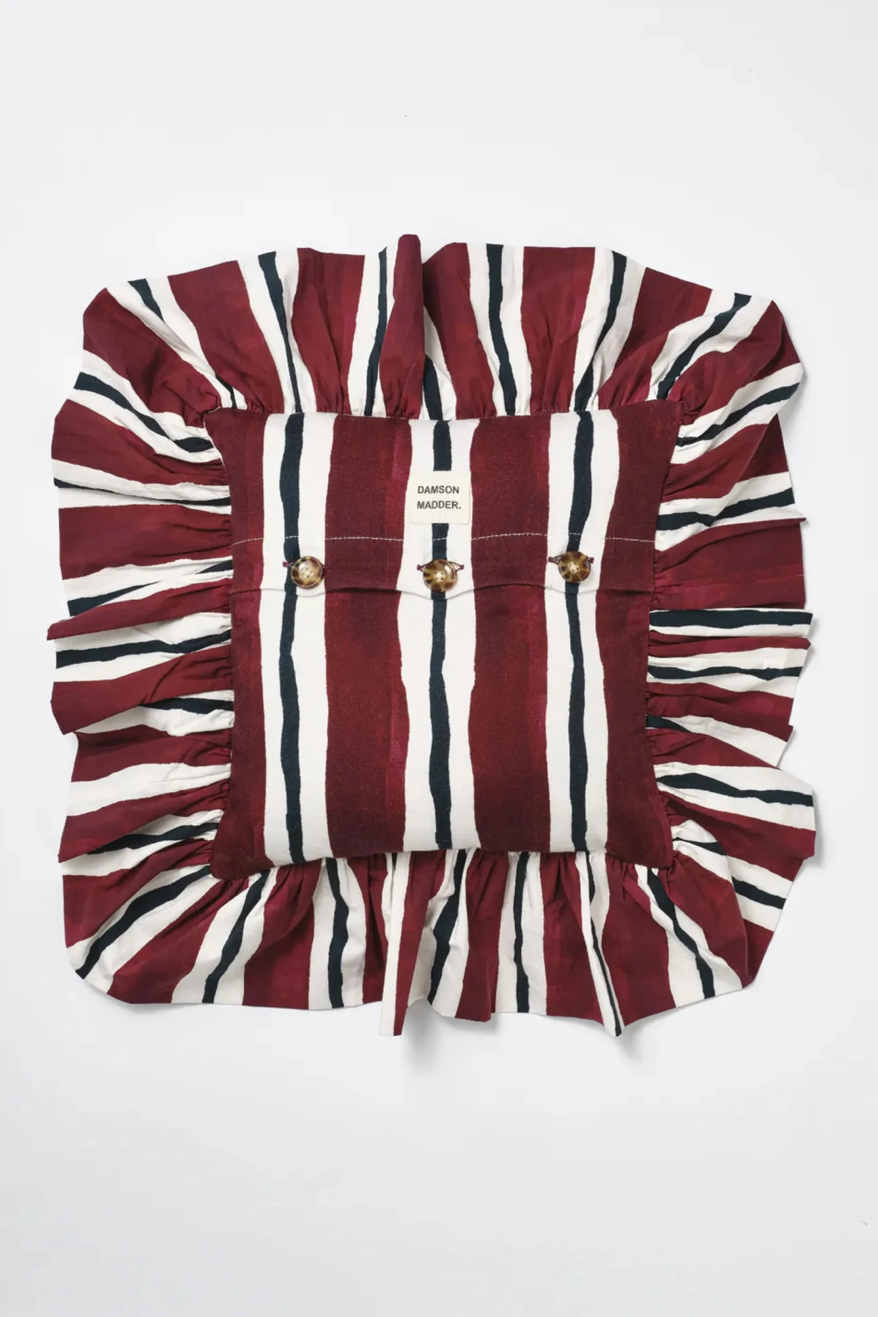 The perfect striped cushion to complement your living room or bedroom, featuring a beautiful frill detail and handcrafted tortoise shell buttons at the opening for a refined, artisanal touch. This cushion is designed in London and made with intricate attention to detail. Measuring 11.8 x 11.8 in (excluding frill), Mix and match it with the Damson Bedding Throw, the ideal way to bring warmth and character to your home this autumn.