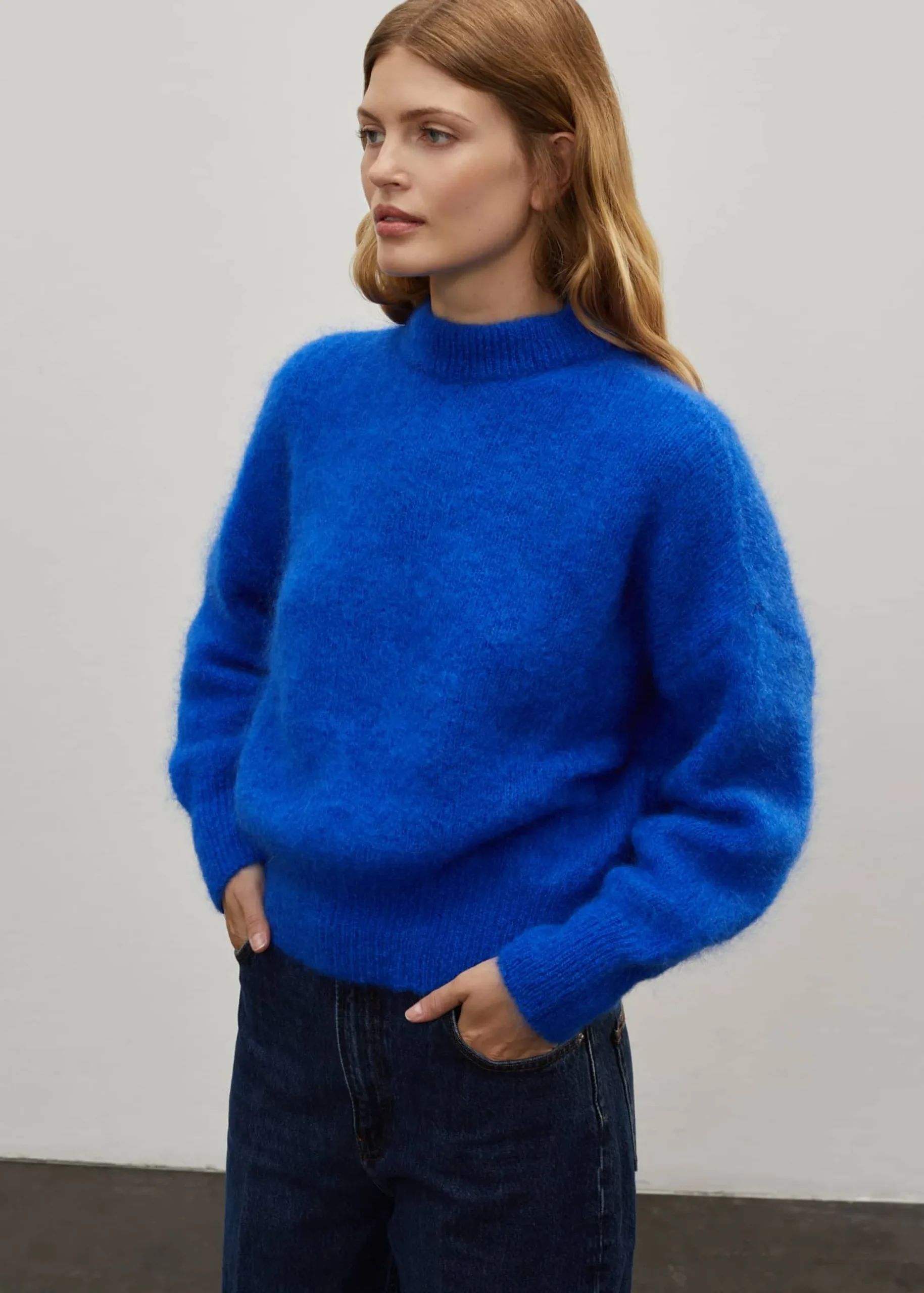 The Jane mohair sweater is cut fairly short. It is designed to fall delicately on your hips. The volume of the body and the high ribbing give it a slight blousant effect.