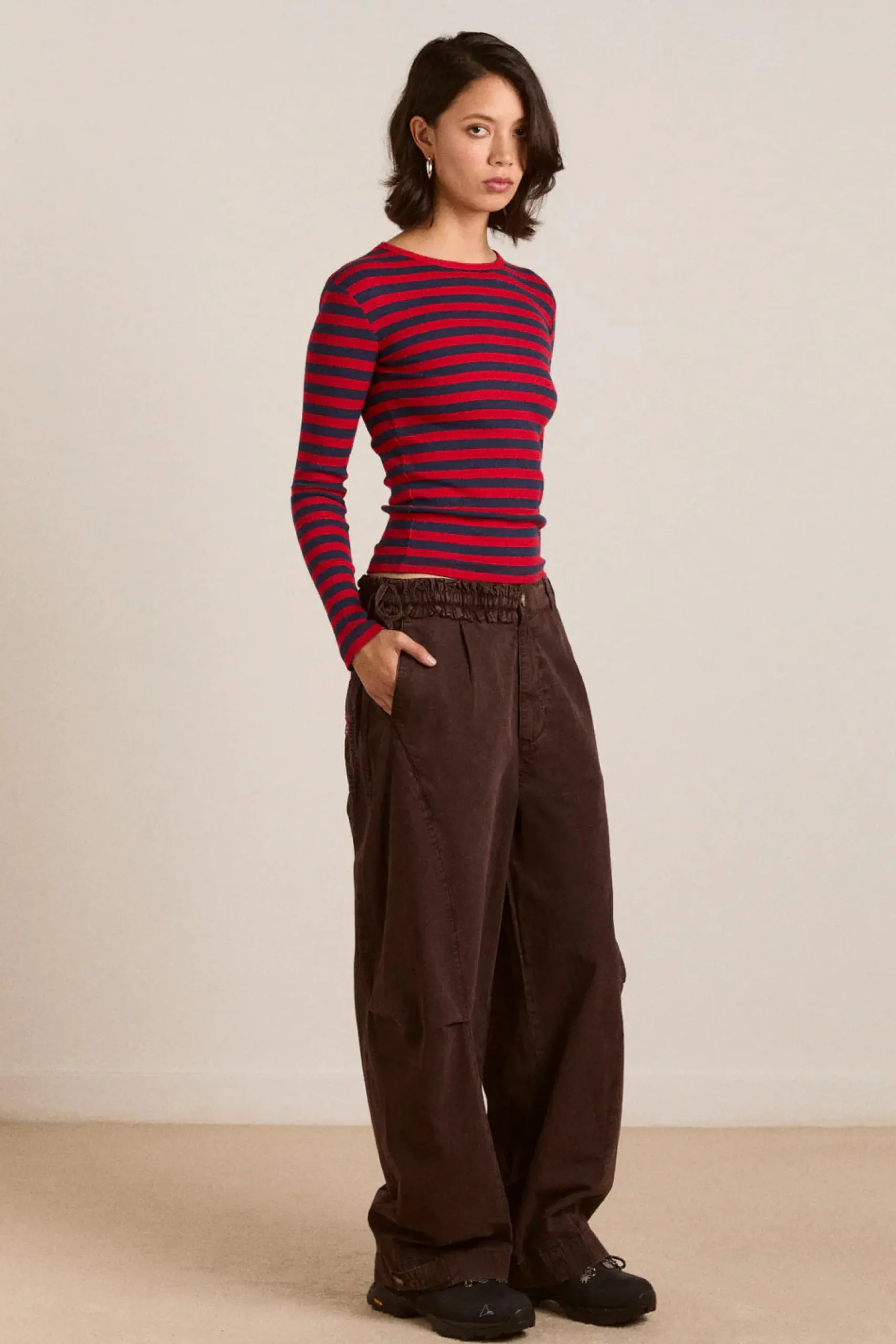 The Liv Trouser in Coffee Bean features a full-length, baggy barrel leg with a relaxed feel and soft organic cotton fabric. Detailed with a ruched frill at the waistband, twisted seams through the leg, and a zip fly with button closure. Designed for easy, everyday wear, pick your usual size.