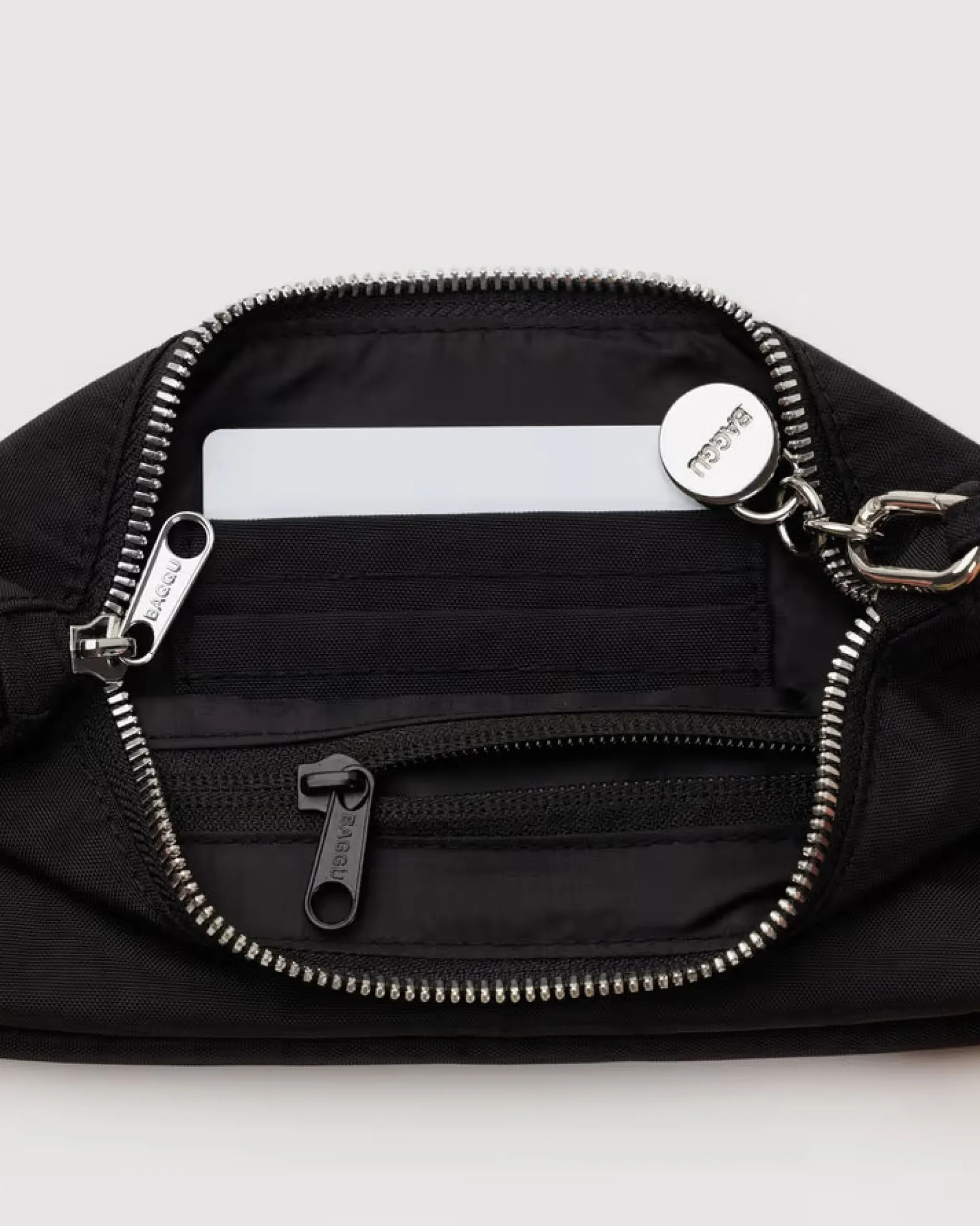 A sleek, compact bag featuring built-in card slots for organization, metal charm, and adjustable strap.