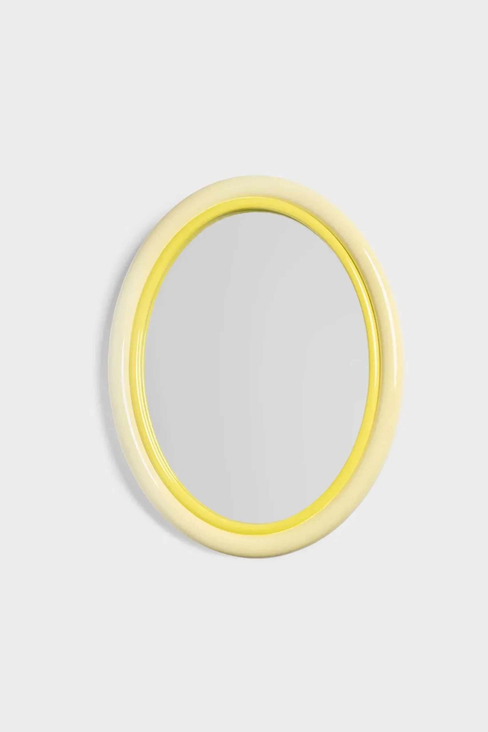 Inspired by puffy shapes, this mirror brings a sleek atmosphere to your home. With its elegant frame and playful colors, this mirror is also a unique decoration. You can mount this mirror using the hook on the back. Screw not included.