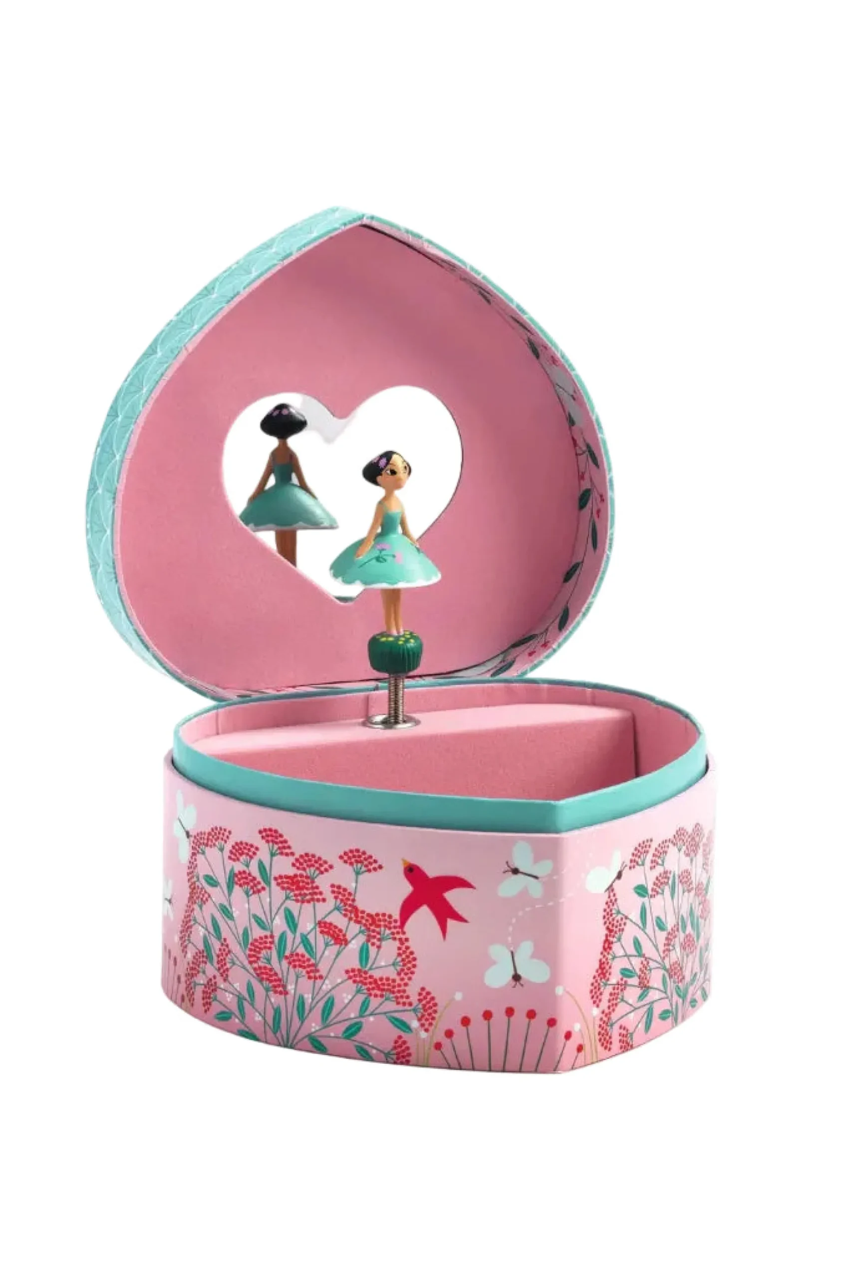 Mélodie du printemps is a pretty, heart-shaped music box for keeping jewelry and secret things in. Turn the handle and open the box for a surprise! A delicately carved dancer turns, reflected in a shaped mirror, to Carl Maria Von Weber’s “Invitation to the Dance”.