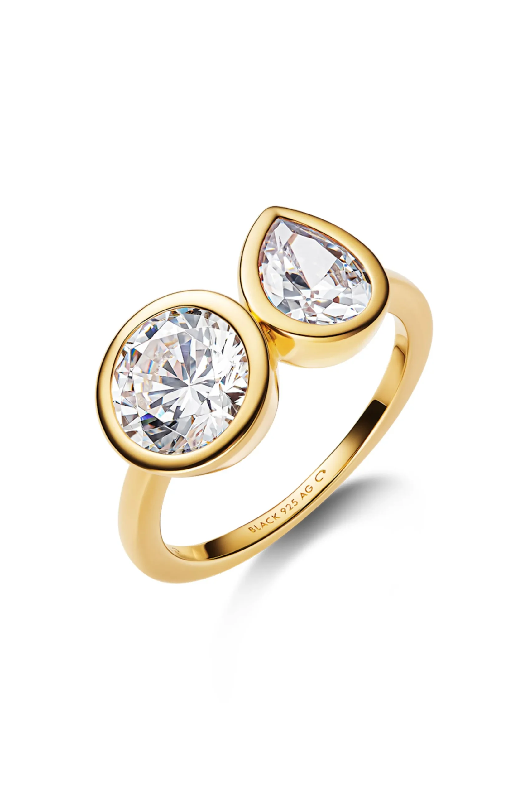 A modern take on Moi et Toi ring design. This ring is a symbol of the union of 2 with it’s bezel set round and pear shaped faceted white zirconia stones. An 18K gold plated over sterling silver with white zirconia stones.